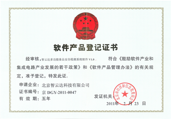軟件產品登記證書——智云達多功能食品安全檢測系統(tǒng)軟件V1.0