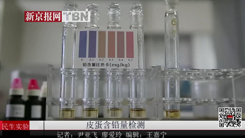 智云達技術(shù)工程師于勇首先挑選5種新京報記者從超市、菜市場、批發(fā)市場選購了來自不同產(chǎn)地包裝上標注“無鉛工藝”字樣的皮蛋,其中還包括了一種鵪鶉皮蛋。把皮蛋剝殼,用剪刀剪碎,稱取2.5克,在提取瓶中加入10ml蒸餾水,用吸管攪勻,靜置10分鐘。10分鐘之后吸取上清液1ml到玻璃比色管中,然后在比色管中分別加入試劑一、試劑二、試劑三各一滴,然后蓋塞搖勻,靜置1分鐘。1分鐘后在比色管中分別加入10滴試劑四溶液,蓋塞搖勻后立即與比色卡比較。皮蛋里鉛含量越高,紅色就越深,如果不含鉛,則溶液就完全呈現(xiàn)藍色,比色管里的5種皮蛋溶液顯示出淺咖色。
