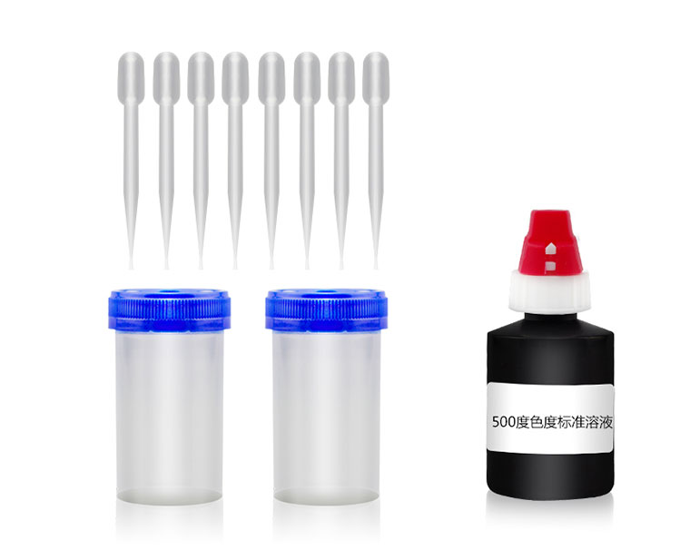 2. 為了增加色度的可視性,可取一只50mL塑料比色瓶,加入18滴(0.9mL)或24滴(1.2mL)500度的色度標(biāo)準(zhǔn)溶液,加入純凈水到30mL,相當(dāng)于15或20度的色度標(biāo)準(zhǔn)對(duì)照溶液。另一支比色管,加水樣到30mL,與色度標(biāo)準(zhǔn)對(duì)照溶液比對(duì)。