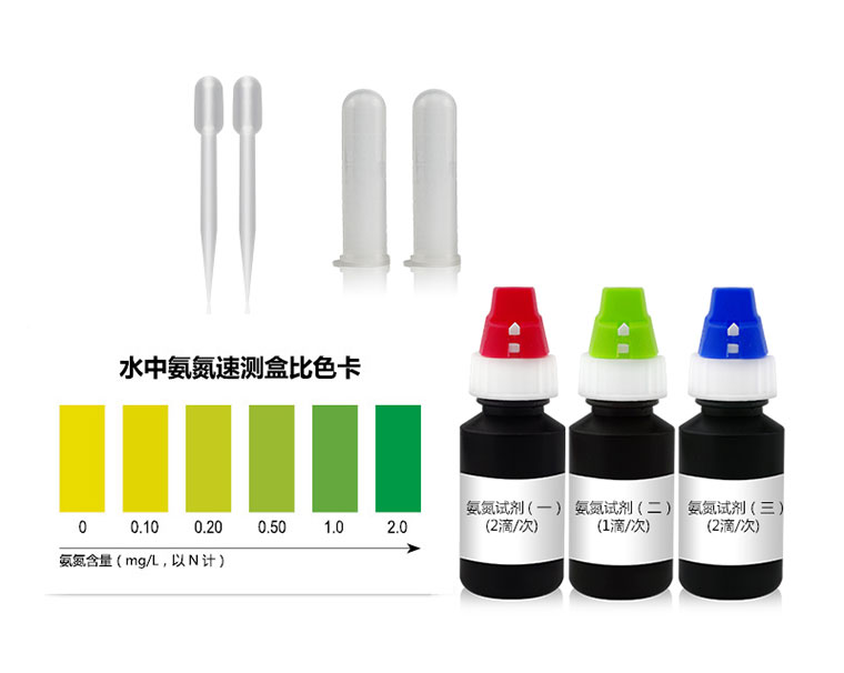 水中氨氮與檢測試劑反應(yīng)生成藍(lán)色物質(zhì),含量越高藍(lán)色或綠色越深。