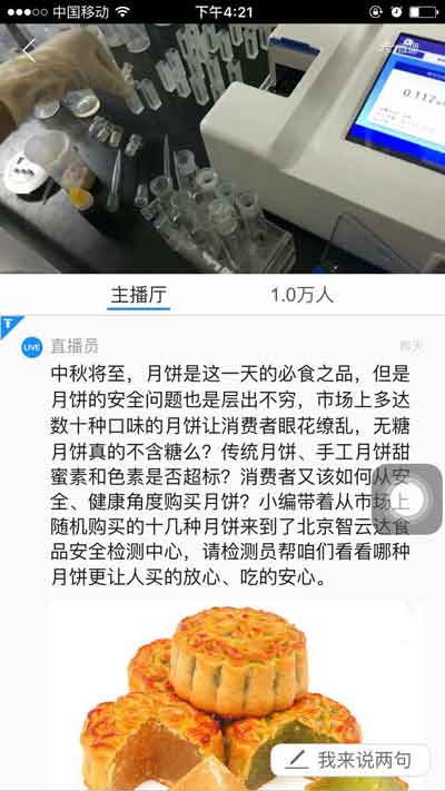 北京智云達(dá)本次與騰訊大燕網(wǎng)聯(lián)合直播,直播間為OMG!現(xiàn)在的月餅?zāi)氵€敢吃嗎?直播過程中在線人數(shù)突破一萬,并在持續(xù)增長(zhǎng)中;直播過程中許多熱心網(wǎng)友進(jìn)行提問,北京智云達(dá)技術(shù)人員都一一進(jìn)行詳細(xì)解答。
