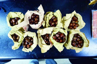 記者稱買一斤,小販拿出紙袋,往里盛了兩勺栗子遞給記者。