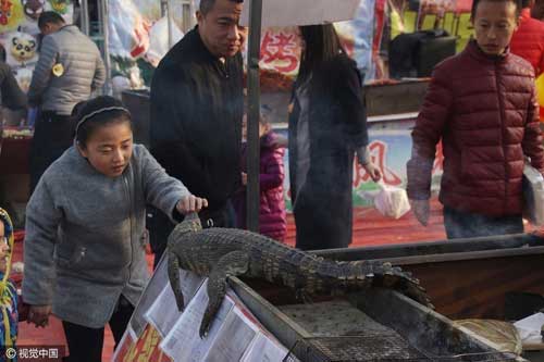 2017年1月31日,山東濱州,一燒烤攤主在春節(jié)廟會(huì)上銷售現(xiàn)烤現(xiàn)賣的鱷魚肉。廟會(huì)上,各類烤肉串、羊肉串已經(jīng)不鮮見,但烤鱷魚肉不少趕廟會(huì)的人還是第一次見,許多市民爭(zhēng)相嘗鮮。為了吸引顧客,攤主擺了張著大嘴的整條鱷魚當(dāng)招牌。