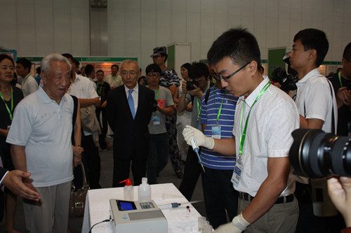 當(dāng)鄒家華首長(zhǎng)來(lái)到展會(huì)的現(xiàn)場(chǎng)操作區(qū)時(shí),智云達(dá)食品安全檢測(cè)工程師于勇的實(shí)驗(yàn)吸引領(lǐng)導(dǎo)駐足觀看,隨后鄒家華首長(zhǎng)對(duì)現(xiàn)場(chǎng)進(jìn)行的農(nóng)藥殘留實(shí)驗(yàn)進(jìn)行了詳細(xì)的詢問,了解了食品快檢的工作原理及作用,提出了相關(guān)問題,并對(duì)目前的工作做出了指導(dǎo)。