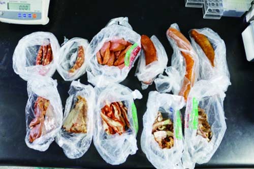 街邊熟食店、市場(chǎng)熟食攤購(gòu)買(mǎi)的香腸4份、臘腸2份、肘子1份、豬頭肉2份、豬耳朵1份、豬蹄1份。