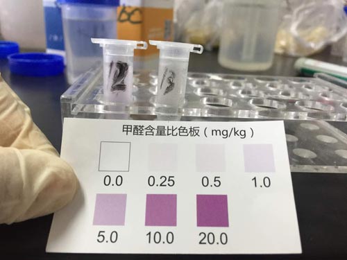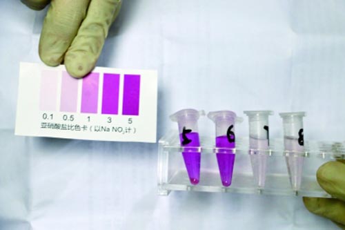 11個(gè)樣品檢測(cè)液顏色均有變化,均檢出亞硝酸鹽成分。其中5號(hào)、6號(hào)呈現(xiàn)紫紅色,亞硝酸鹽含量最高,45mg/kg,高于預(yù)包裝熟食不得超過(guò)30mg/kg的國(guó)家限量標(biāo)準(zhǔn)。