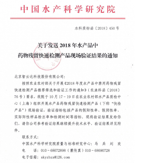 2018年10月17-19日北京智云達科技股份有限公司參加了由農業農村部漁業漁政管理局主辦,中國水產科學研究院承辦的“2018年水產品中藥物殘留快檢產品的驗證”工作。此次驗證在農業農村部水產品質檢中心(上海)舉辦,現場來自21家快檢企業參加了驗證。這次驗證的項目包括氯霉素、呋喃四項、孔雀石綠等共六個項目,是近年來驗證項目最多的一次。現場每個項目使用2個批次產品共檢測84個樣品,檢測指標包括假陽性率、假陰性率、實際樣本檢出率和檢測時間等指標。檢測結果包括專家評判和技術人員自評兩個環節,評判結果表明智云達驗證的產品全部符合評價標準要求,特向市場推薦使用!