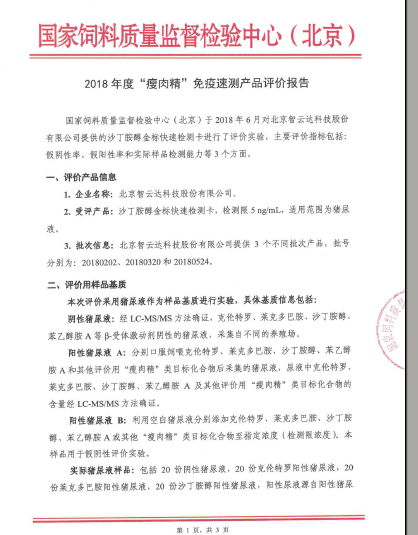 國家飼料質量監督檢驗中心(北京)組織開展的“瘦肉精”免疫速測產品評價工作的結果近日公布,智云達報送的克倫特羅、萊克多巴胺、沙丁胺醇三種免疫檢測卡的假陰性率、假陽性率、實際樣品檢測能力,均滿足評價指標要求!