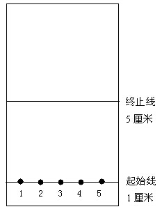 選取一張展開板(薄層板),在展開板上距底邊1厘米和5厘米處各輕畫一條鉛筆橫線(起始線和終止線)。再用鉛筆在起始線上點(diǎn)5個標(biāo)記點(diǎn),間距為0.8厘米。如圖1所示。