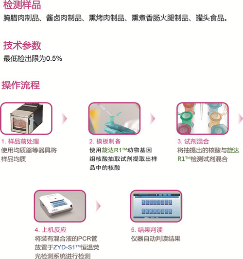 產品用途:能快速、準確地鑒定檢測出樣品中是否含有特定動物源成分,為識破食品摻假的違法活動提供有力依據。