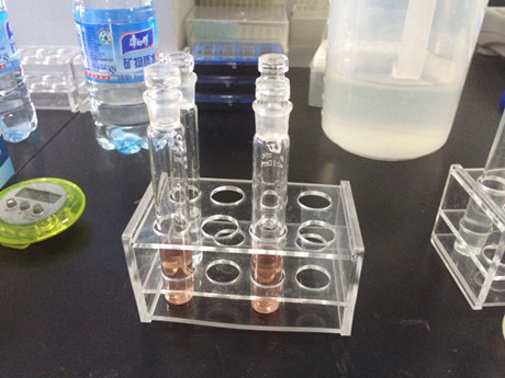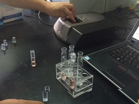 3、 樣品管:分別取0.4mL樣品液于10mL比色管中,做平行測試,分別加B溶液1mL、C溶液0.2mL,混勻,加D溶液0.4mL,搖勻,再加E溶液0.4mL,立即用蒸餾水稀釋至5mL刻線,搖勻,靜置20min,進(jìn)行檢測。空白管:不加E溶液,其余步驟與樣品管同。