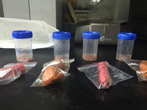 首先我們將吳先生提供的兩種樣品分別進(jìn)行編號(hào),并進(jìn)行少量切割稱重,稱取1.0g火腿樣本,加入10ml蒸餾水;