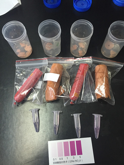 通過(guò)觀察我們可以發(fā)現(xiàn)2號(hào)相對(duì)顏色較深,其他顏色基本不變,這個(gè)說(shuō)明路邊烤腸中亞硝酸鹽含量超標(biāo),而商場(chǎng)火腿亞硝酸鹽含量基本符合標(biāo)準(zhǔn);