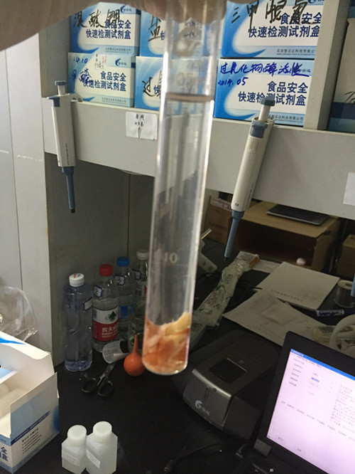 首先我們將雞爪切碎,然后稱取1.25克到25ml比色管中,并用蒸餾水定容到25ml,振蕩搖晃后靜置20min,進行過濾得到樣品液。