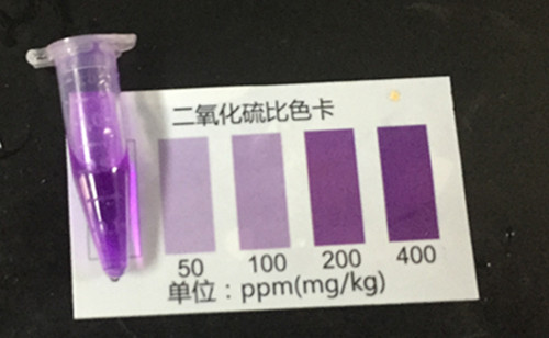 采用二氧化硫速測試管進(jìn)行檢測,稱取1g枸杞樣本加入蒸餾水49ml,攪拌后靜置10min,之后轉(zhuǎn)移1ml到離心管中,加入2d二氧化硫檢測試劑A,1d二氧化硫檢測試劑B。攪拌均勻后,5分鐘后用離心管與比色卡進(jìn)行比色。發(fā)現(xiàn)用二氧化硫的存在。
