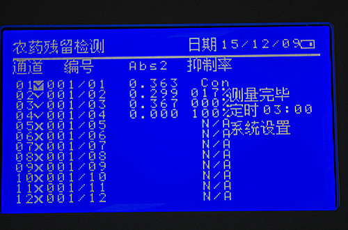 檢測結果如圖所示,結果以酶被抑制的程度,即抑制率表示。當果蔬樣品提取液對酶的抑制率為40~50%時,則表明被測樣品為可疑農殘超標樣品;當抑制率≥50%時,表示蔬菜中有高劑量有機磷或氨基甲酸酯類農藥存在,樣品為陽性結果。