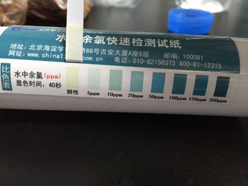 擦掉試紙邊緣多余液體,試紙塊朝上水平放置,40秒時與色卡比較,讀取結(jié)果。結(jié)果顯示余氯符合國家標準。
